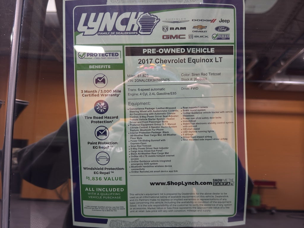 This 2017 Chevrolet Equinox has a clean CARFAX vehicle history report. Protect the Chevrolet Equinox from unwanted accidents with a cutting edge backup camera system. This unit offers Automatic Climate Control for personalized comfort. Never get into a cold vehicle again with the remote start feature on this mid-size suv. The vehicle features a hands-free Bluetooth® phone system. This Chevrolet Equinox has a 4 Cyl, 2.4L high output engine. Keep safely connected while in the vehicle with OnStar. You may enjoy services like Automatic Crash Response, Navigation, Roadside Assistance and Hands-Free Calling. Maintaining a stable interior temperature in this 2017 Chevrolet Equinox is easy with the climate control system. The Chevrolet Equinox excites both driver and bystanders with a polished red exterior with racy lines. This vehicle is front wheel drive. The high efficiency automatic transmission shifts smoothly and allows you to relax while driving. Help alleviate lower back pain with the driver seat lumbar support in it.