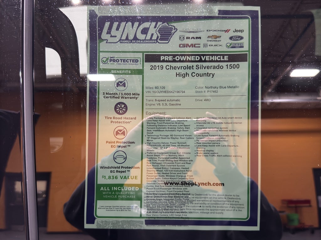 Find exceptional value with this 2019 Chevrolet Silverado 1500 High Country, a premium 4WD pickup powered by a robust V8 5.3L gasoline engine. Located in Burlington, WI, this High Country blends luxury appointments with rugged capability, giving you confidence on work sites, weekend adventures, and daily driving. The exterior features premium wheels and a refined finish, while the interior offers heated and ventilated seating, advanced infotainment, and upscale trim that elevate the driving experience.