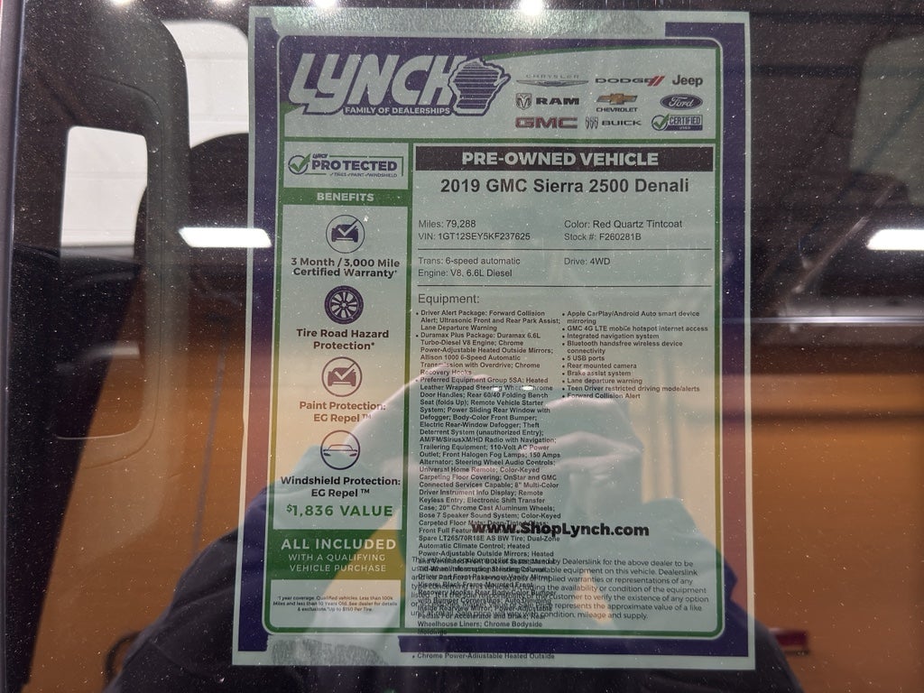 2019 GMC Sierra 2500 Denali 4WD — 6.6L V8 Diesel. Located in Burlington, WI, this premium heavy-duty truck pairs rugged capability with upscale comfort, and it's priced to be the best value in the area. Powered by a proven 6.6L Duramax V8 diesel and a robust four-wheel-drive system, the GMC Sierra 2500 Denali delivers exceptional towing, confident off-road traction, and long-haul efficiency for work or recreation.