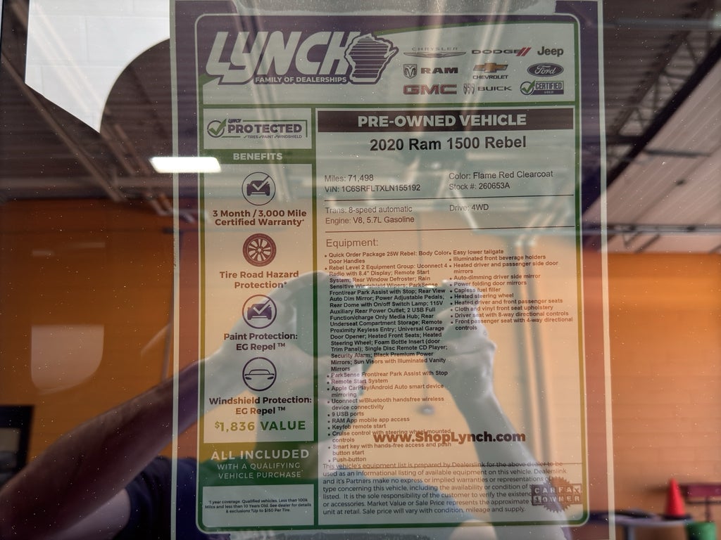 2020 Ram 1500 Rebel 4WD - powerful presence and off-road capability in Burlington, WI. This rugged Rebel comes equipped with a V8 5.7L gasoline engine and heavy-duty 4WD, delivering confident towing and trail-ready performance. The bold exterior and lifted stance are matched by a well-appointed interior that supports both work and weekend adventures.