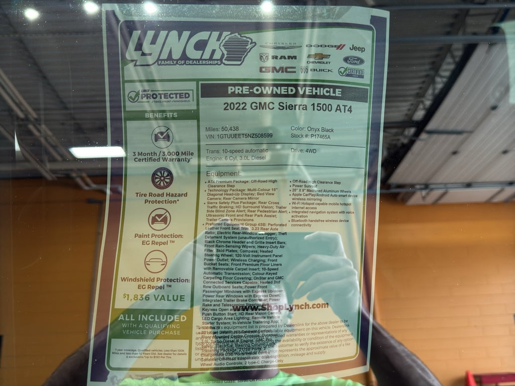 Looking for a powerful, rugged pickup with refined comfort? This pre-owned 2022 GMC Sierra 1500 AT4 combines a torquey 3.0L inline-6 diesel with part-time 4WD and upgraded off-road capability, ready for worksite duty or weekend trails. The AT4 trim includes an Off-Road Package with skid plates, twin-clutch rear axle enhancements, and specially tuned suspension so you can tackle rough terrain confidently.