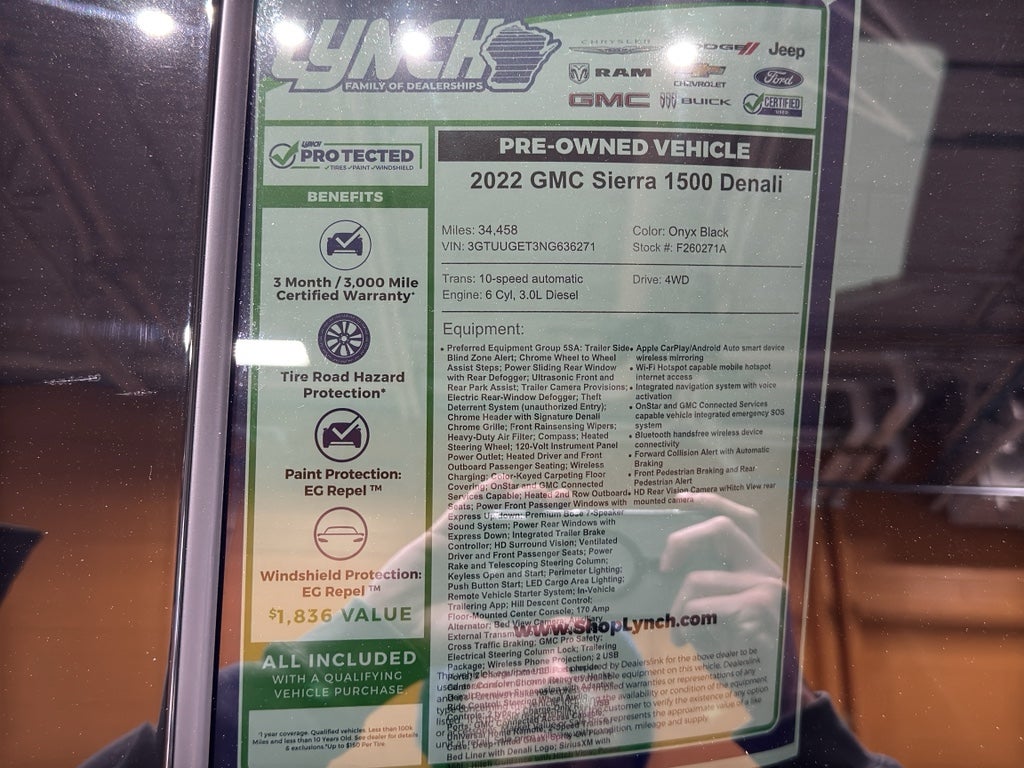 2022 GMC Sierra 1500 Denali — 3.0L Duramax Turbo-Diesel, 4WD, 34,461 miles. Located in Burlington, WI, this premium GMC Sierra Denali blends rugged capability with refined comfort, and it's priced to move.