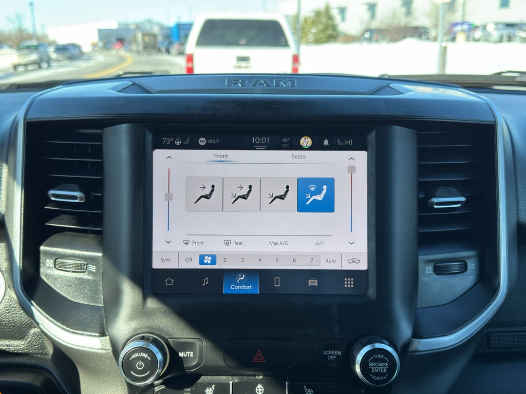 Quick Order Package 23Z Big Horn: Big Horn Badge. Big Horn Level 2 Equipment Group: Google Android Auto; SiriusXM Radio Service; Bluetooth® Handsfree Phone and Audio; USB Host Flip; Rear Window Defroster; Integrated Center Stack Radio; ParkSense Front/rear Park Assist with Stop; Rear View Auto Dim Mirror; Power Adjustable Pedals; For More Info. Call 800-643-2112; Rear Power Sliding Window; Rear Dome with On/off Switch Lamp; Glove Box Lamp; 115V Auxiliary Rear Power Outlet; GPS Antenna Input; Media Hub with 2 Charge Only USBs; Exterior Mirrors with Heating Element; Power 8-Way Driver Seat; Auto Dim Exterior Driver Mirror; Heated Front Seats; Uconnect 5 W Radio with 8.4" Display; Heated Steering Wheel; 8.4" Touchscreen Display; Black Exterior Mirrors; Class IV Receiver Hitch; Security Alarm; Black Premium Power Mirrors; Apple CarPlay; Big Horn Instrument Panel Badge; Remote Start System; SiriusXM Satellite Radio; Exterior Mirrors with Supplemental Signals; Exterior Mirrors Courtesy Lamps; Air Conditioning ATC with Dual Zone Control; 115V Auxiliary Power Outlet; Cluster 7.0" TFT Color Display; Universal Garage Door Opener; Power-Folding Mirrors; Convex Wide-Angle Mirror Insert; Sun Visors with Illuminated Vanity Mirrors; Power 2-Way Driver Lumbar Adjust. Night Edition: 275/55R20 OWL All Season Tires; Deluxe Cloth Bucket Seats; Accent Color Premium Power Mirrors; Black Headlamp Bezels; Black Exterior Truck Badging; Anti-Spin Differential Rear Axle; 20" X 9.0" Premium Paint/polished Wheels; Grille Surround 1 Black Texture 2 Black; Black Interior Accents; Dual Exhaust with Black Tips; Body Color Front Bumper; Body Color Rear Bumper with Step Pads; Black Painted Exterior Mirrors Caps. Deluxe Cloth Bucket Seats. Anti-Spin Differential Rear Axle. ParkSense Front/rear Park Assist with Stop. 115V Auxiliary Power Outlet. Granite Crystal Met CC. Remote Start System. MOPAR Front and Rear Rubber Floor Mats. Cluster 7.0" TFT Color Display. **Equipment listed is based on original vehicle build and subject to change. Please confirm the accuracy of the included equipment by calling the dealer prior to purchase.**