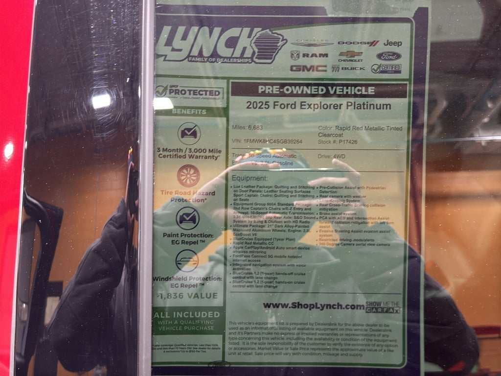 2025 Ford Explorer Platinum — low-mileage, premium 4WD SUV in Burlington, WI. This stunning Ford Explorer Platinum with only 6,683 miles combines a powerful V6 3.0L gasoline engine and four-wheel drive for confident performance in any season. The vehicle offers top-tier comfort and technology: genuine leather seats, Apple CarPlay for seamless smartphone integration, a back-up camera for safer parking, and convenient remote start.