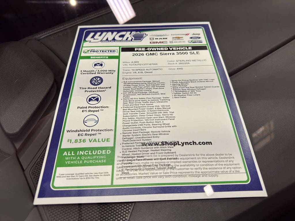Discover this 2026 GMC Sierra 3500 SLE, now available in Burlington, WI — a rugged, capable pickup with only 4,069 miles and competitively priced for immediate ownership. Powered by a V8 6.6L Duramax diesel and equipped with four-wheel drive, this GMC Sierra delivers exceptional towing and hauling performance while offering fuel-efficient diesel torque for demanding jobs.